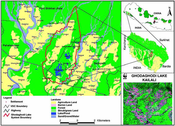 Ghodaghodi is a natural freshwater oxbow lake on the lower slopes of Siwalik. It is a large and shallow lake, having finger-like projections, with associated marshes and meadows surrounded by tropical deciduous forest on the lower slopes of Siwalik range. There are thirteen associated lakes and ponds, and some streams separated by hillocks situated on the periphery of Ghodaghodi. The forest and wetlands are wildlife corridor between the low land (Terai) and the Siwaliks.